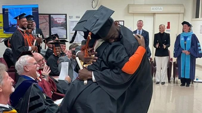 An inmate from Sampson Correctional Center celebrates after receiving a degree from Campbell University in November 2023. Nine graduates received Associate of Science degrees and nine received Bachelor of Science degrees at the ceremony. (N.C. Department of Adult Correction)